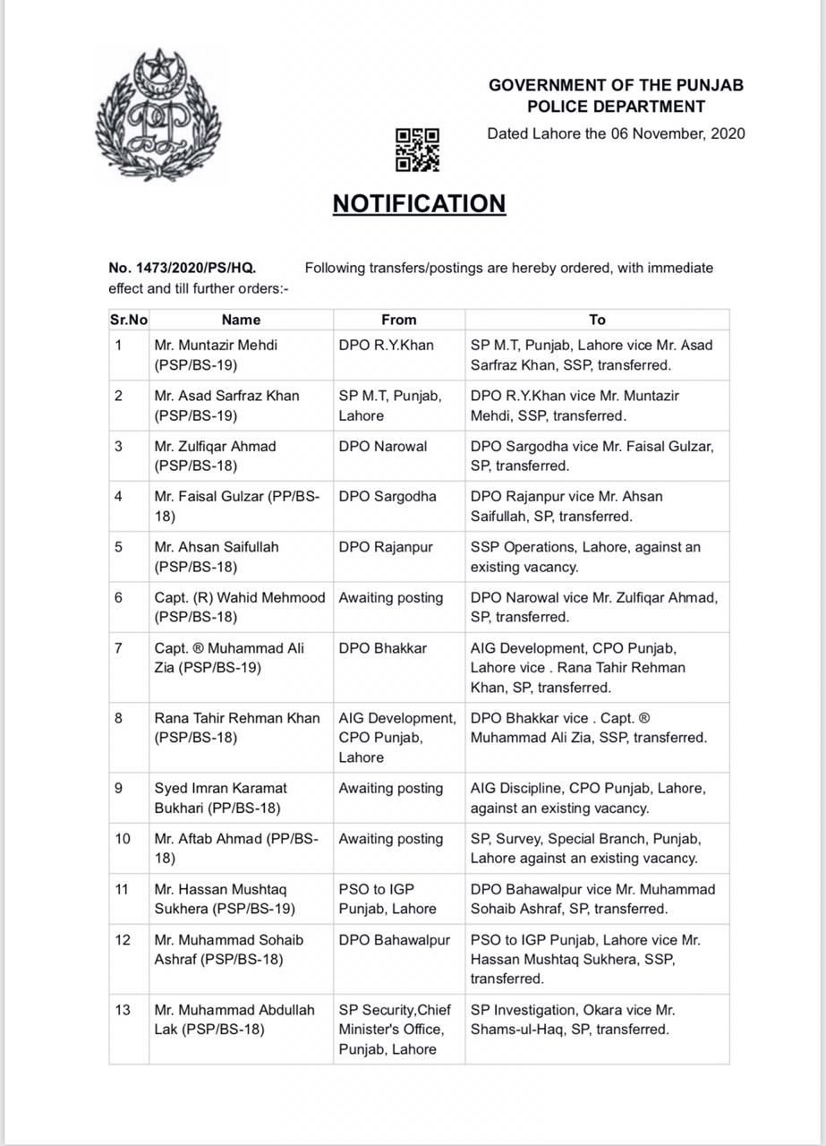 1۔ڈی پی او رحیم یار خان منتظر مہدی کو ایس پی موٹر ٹرانسپورٹ لاہور تعینات کردیا گیا ۔