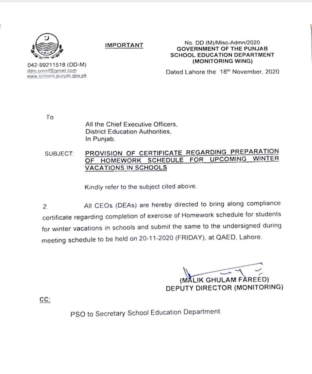 - کرونا وباء کی دوسری لہر پنجاب میں تمام تعلیمی ادارے 24 نومبر سے بند کرنے کا نوٹیفکیشن جاری تعطیلات کا دورانیہ 5 ہفتوں پر محیط ہوگا زیر تعلیم طلباء کو ایک ماہ کا ہوم ورک دینے کے احکامات جاری وفاقی وزارت تعلیم نے تعلیمی اداروں کے حوالے سے صوبوں کو تجاویز بجھوا دیں تعلیمی ادارے 24 نومبر سے 31 جنوری تک بند کر دیئے جائیں 24 نومبر سے پرائمری سکول بند کردیئے جائیں 2 دسمبر سے مڈل سکول بند کر دیئے جائیں 15 دسمبر سے سکینڈری اور ہائر سکینڈری سکول بند کر دیئے جائیں تعلیمی سیشن 31 مئی تک بڑھانے کی تجویز میٹرک اور انٹرمیڈیٹ کے امتحان جون میں لیے جائیں اساتذہ کو آن لائن کلاسوں کی تیاری کے لیے اداروں میں بلوایا جائے۔23 نومبر کی بین الصوبائی وزرائے تعلیم کانفرنس میں صوبے اپنی تجاویز دیں گے۔