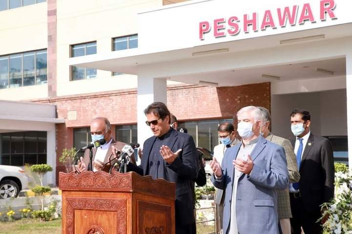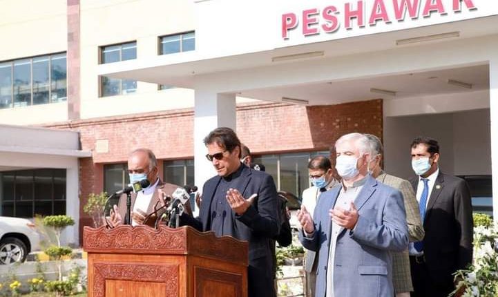 وزیرِ اعظم عمران کی حیات آباد سپورٹس کمپلیکس آمد وزیرِ اعلی محمود خان، گورنر شاہ فرمان اور صوبائی وزیرِ خزانہ تیمور سلیم جھگڑا نے استقبال کیا