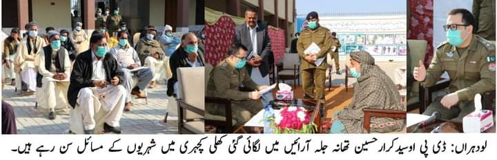ہم بحثیت مسلمان حق سچ کی گواہی دیں تو جرائم میں کمی واقع ہوسکتی ہےجرائم پیشہ افراد سے کوئی رعایت نہیں ہو گی ان کے خلاف کارروائیوں میں عوام پولیس کی مدد کریں۔ان خیالات کا اظہار ڈسٹرکٹ پولیس آفیسر سید کرار حسین نے تھانہ جلہ آرائیں میں کرونا ایس او پیز پر عمل کرتے ہوئے عوامی مسائل کے حل کے لئے لگائے جانے والی کھلی کچہری میں کیا۔کھلی کچہری میں شہریوں کی درخواستوں کی فرداًفرداً سماعت کے بعد متعلقہ افسران کو فوری انکوائری و کارروائی کے احکامات جاری کیے گئے۔ڈی پی او سید کرار حسین نے کہا کہ عوام کو فوری انصاف کی فراہمی ،میرٹ اور قانون کی بالادستی کو ہر صورت یقینی بنایا جائے گا کھلی کچہری کا مقصد دور دراز علاقوں میں پہنچ کر شہریوں کے مسائل ان کی دہلیز پر حل کرنا اور محکمہ پولیس کی کارکردگی کا عوام کے سامنے جائزہ لینا ہےشہری اپنےگھروں کے باھر روشنی کو یقینی بنائیں جس سے جرائم کی روک تھام میں مدد ملے گی اور تاجر برادری اپنی دکانوں کی حفاظت کے لۓ باھمی اشتراک سے چوکیداروں کا انتظام بھی کریں شہری اپنے گلی محلہ میں ٹھیکری پہرہ اور چوکیدارہ سسٹم کا قیام عمل میں لائیں جس سے پولیس کی مانیٹرنگ اور سکیورٹی سسٹم میں مزیدبہتری آئے گی۔